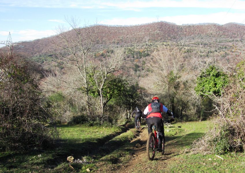 Note: La preoccupazione di trovare il trail dei tralicci in pessime condizioni era forte, ma possiamo ritenerci fortunati avendolo trovandolo in un discreto stato. Sebbene non sia un sentiero segnalato, per l’aggiunta con un cospicuo strato di foglie cadute, è comunque risultato di facile intuizione seguirne il tragitto. La parte finale è molto più evidente, ma in quest’ultima, su un breve tratto prativo, semi pianeggiante si è pagato qualche piccolo inconveniente, per via del fango argilloso che s’attacca come la peste, presente anche se il periodo è poco piovoso. Sulla prima parte di salita per l’altura del Cavone, si è stati costretti a spingere sulla carrareccia, per qualche centinaio di metri, per via dei residui di ramaglie lasciati sul suolo, pertinenti il taglio del bosco. A far da padrone lungo il percorso, sono soprattutto gli impegnativi tratti rocciosi, si sconsiglia a chi non ha buone doti di tecnica di guida.