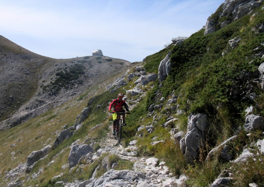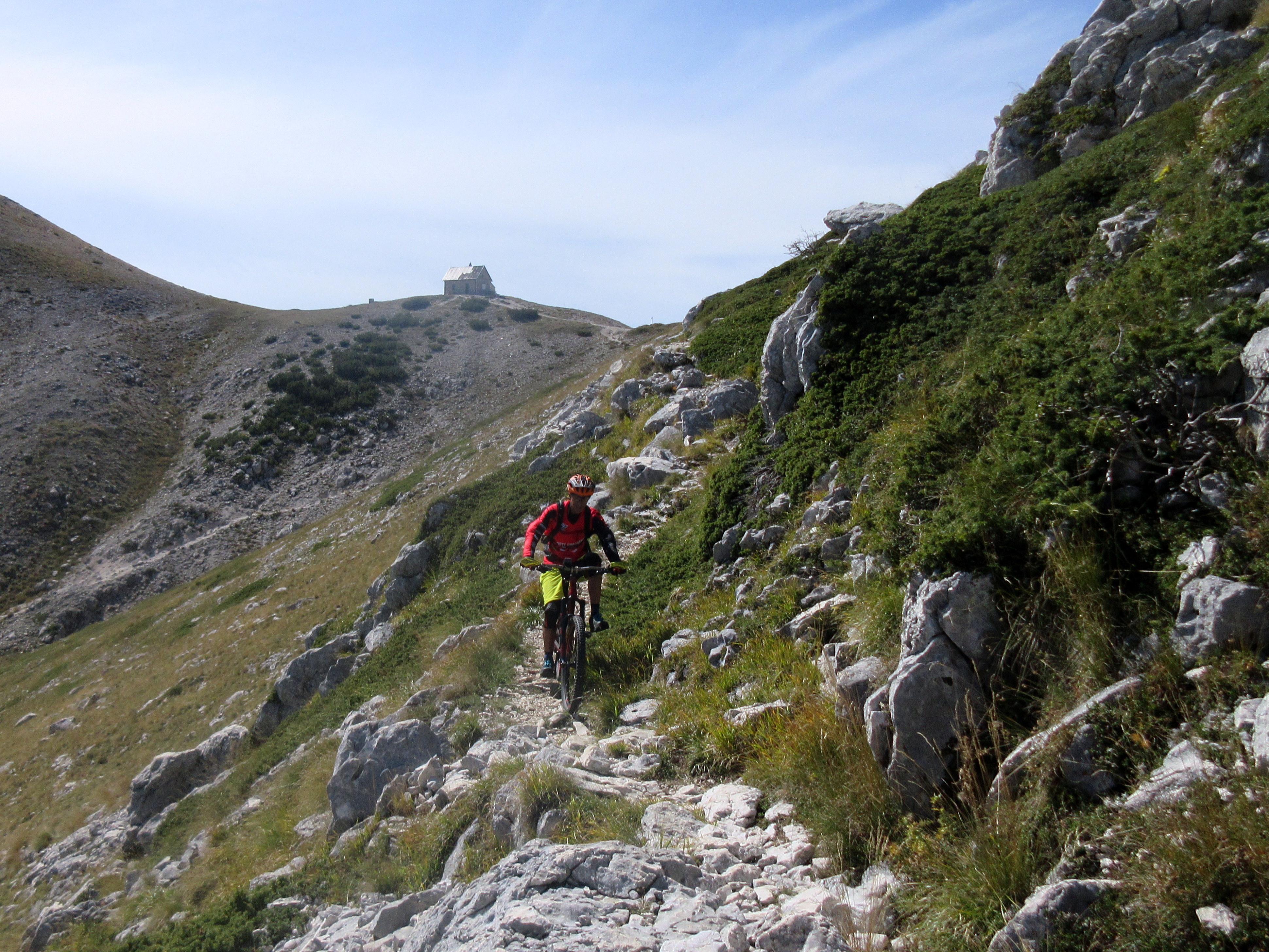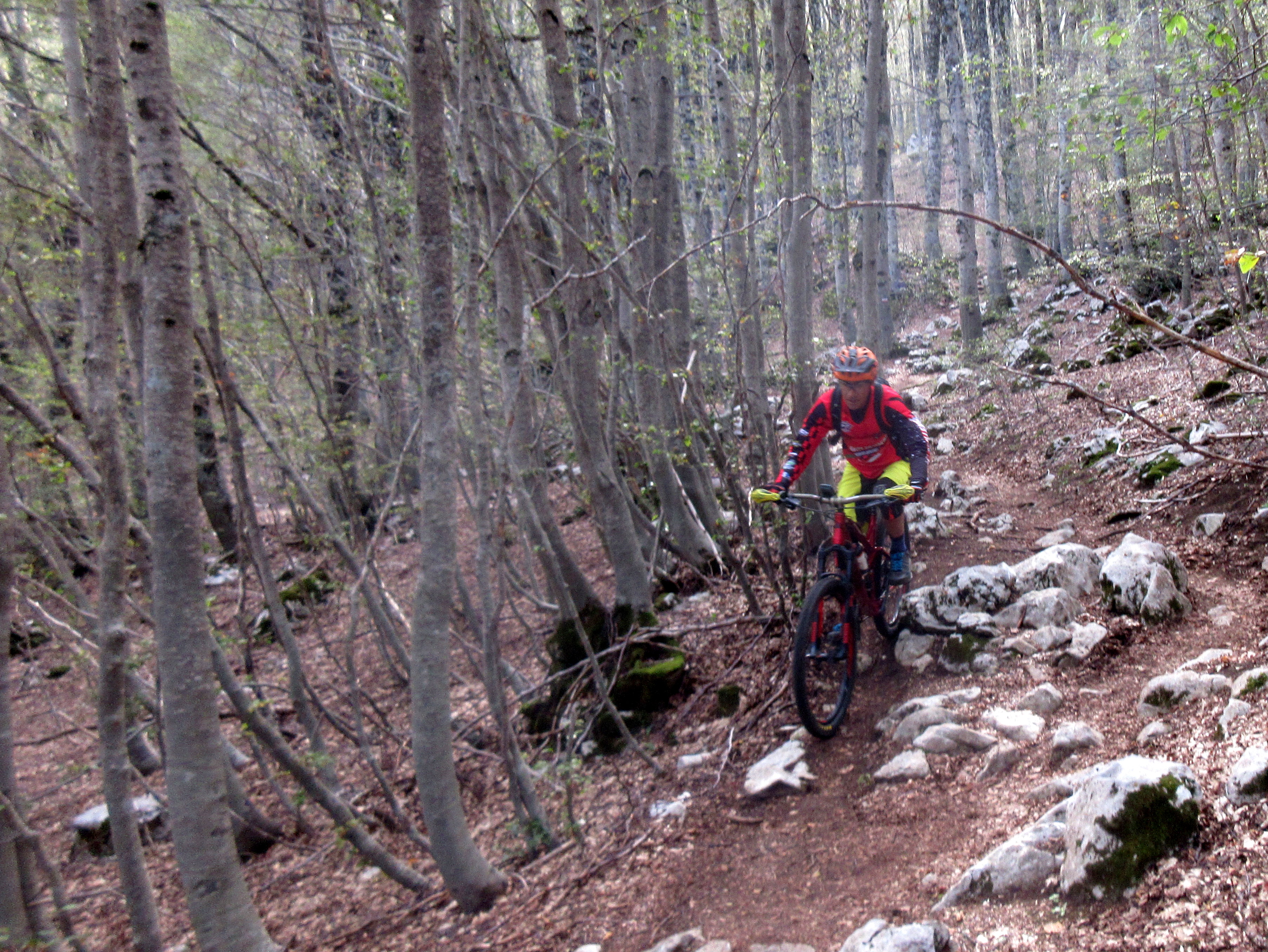 Oltrepassato il minuscolo intaglio del valico, il trail con fondo smosso e rocce sporgenti inizia a scendere a giravolte, è tanto tecnico ed impegnativo, necessita di equilibrio e abilità, lo sconnesso dà la possibilità di giocarsi vari jolly. Ma presa confidenza con l’aspro sentiero si inizia a stare in sella, aiutandosi qua e là col piede a terra. Dopo gli ultimi scorci sulla valle ci si addentra nel bosco, qua di colpo si cambia marcia, il fondo sempre disseminato di pietre, si fa più terroso allentando la morsa del tecnicume.