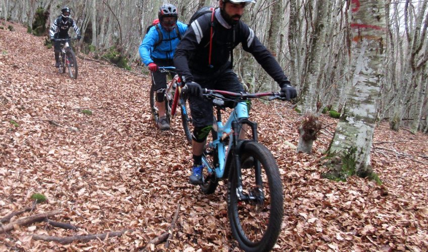Si anticipa la partenza, si unisce Emanuele Montegrosso, Andrea Martinella, etc.. bitumando si risale verso le frazioni di Pietrasecca e Montorio in Valle, arrivando al bosco di conifere, guadagnando l’altura del Faito. Questa volta si è più distesi, con una pedalata più sciolta ed un fiato meno corto. Il primo tratto di discesa dove il sentiero è “poco evidente”, s’è superato con estrema disinvoltura si continua poi con più vivacità.
