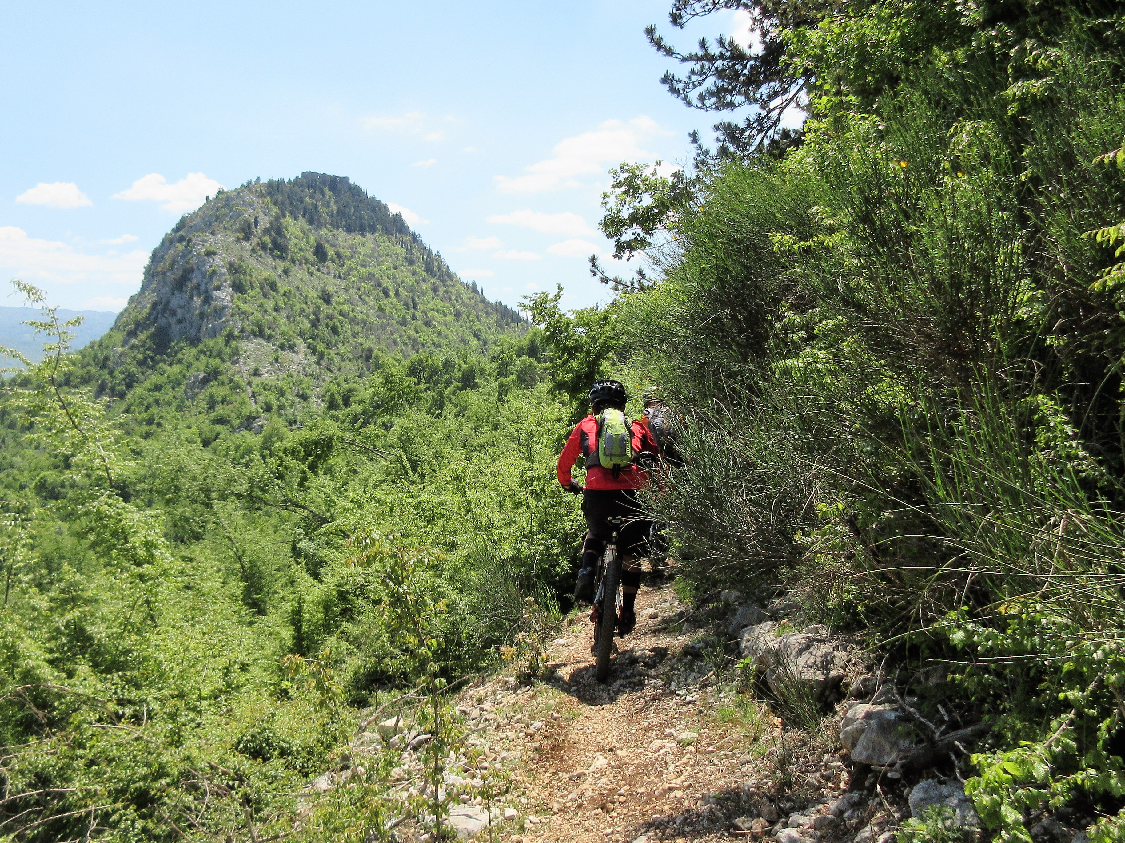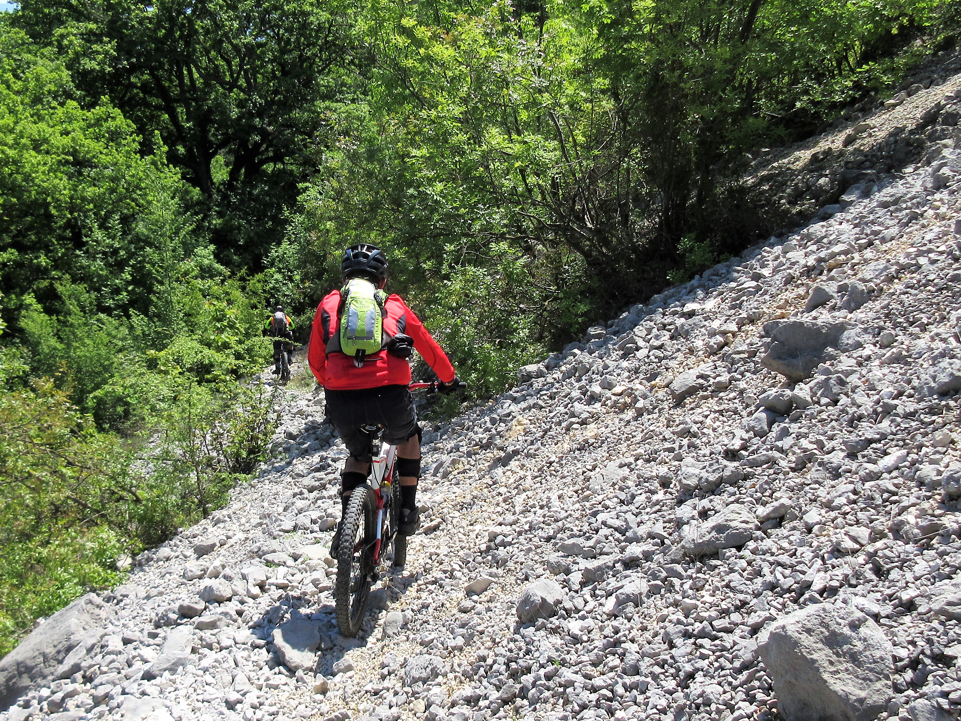 Poi si alternano tratti di sentiero e mulattiera sempre a saliscendi e benché il percorso sia stato ripulito di recente la vegetazione nei punti dove il sentiero è meno ampio si è già rimpossessata dell’ambiente. Superato una frana e degli alberi sradicati, il sentiero diventa più ostico ed in alcuni punti trialistico, con fondo sassoso, dove i rilanci diventano faticosi. Percorrendo un tratto molto pietroso