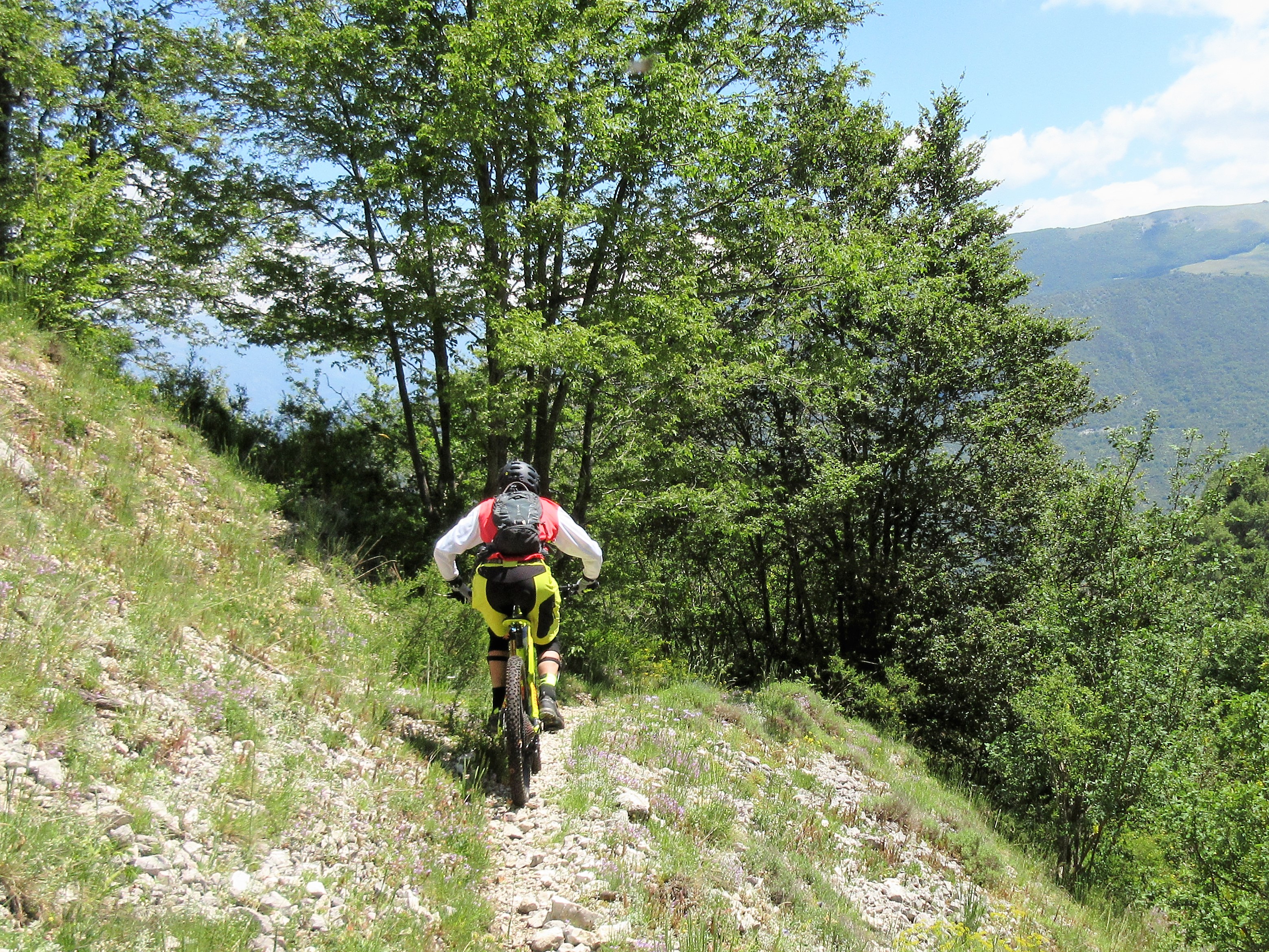 Poter ammirare il panorama sulla valle del Sagittario, Castrovalva e Anversa degli Abruzzi da questa prospettiva è davvero molto suggestivo e come dice “Rpapero ci fa sentire dei privilegiati”. Stupefatti si riprende a scendere, il flow sarà solo un ricordo, il trail diventa molto accattivante, seguono tratti esposti, il fondo repentinamente diventa
