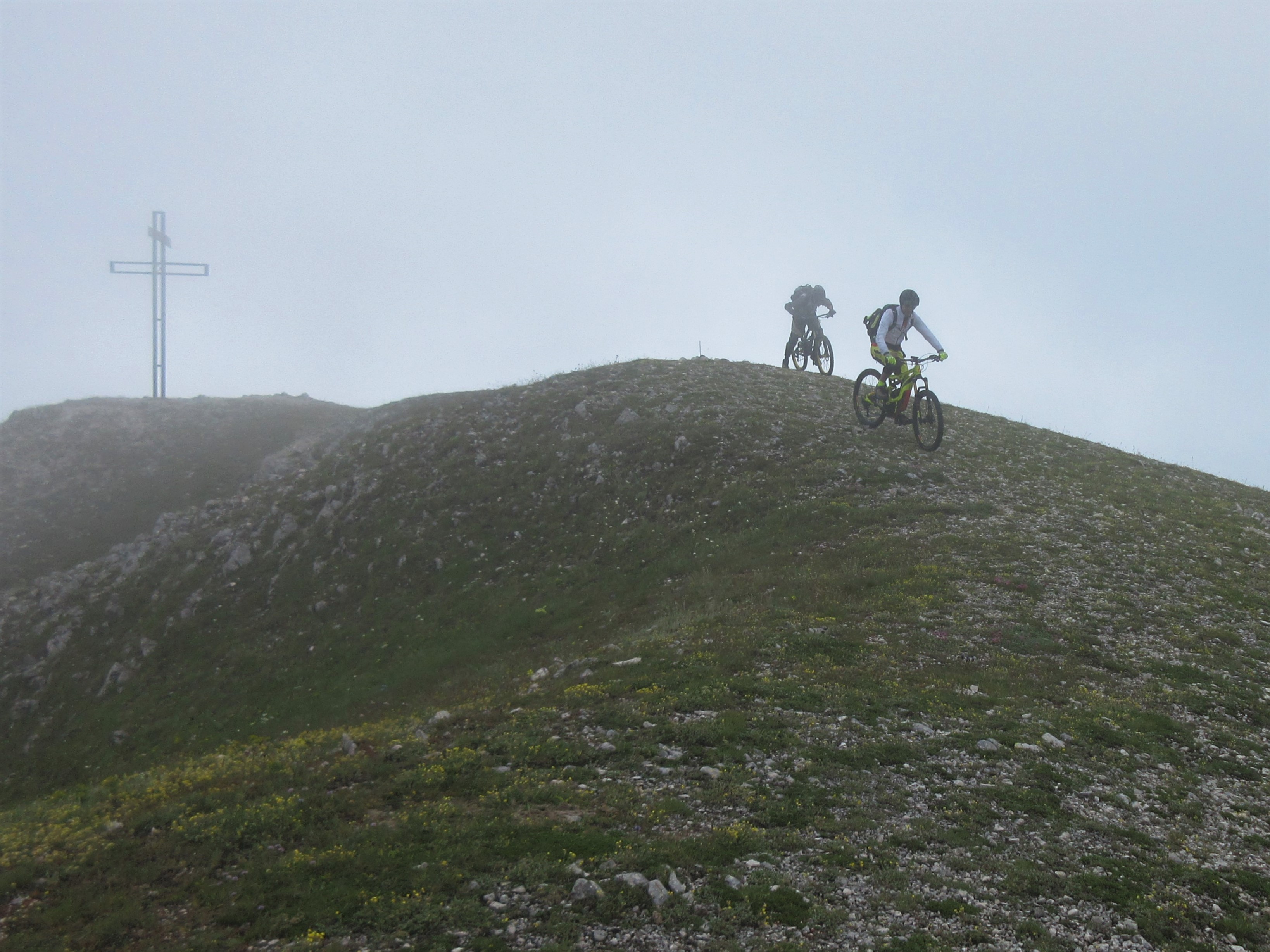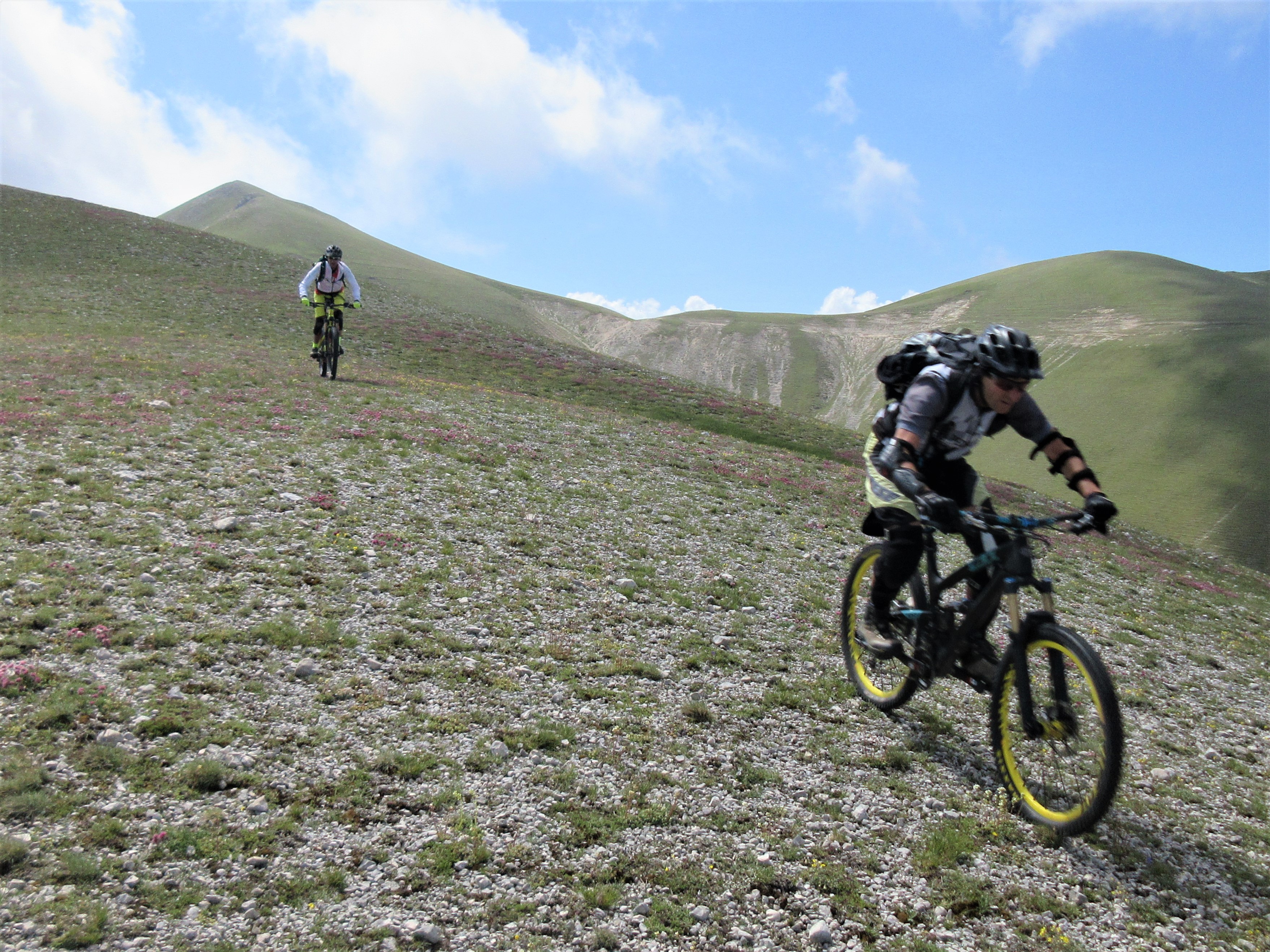fondo breccioso, poi si devia, procedendo tortuosamente sul prato, guadagnando a spinta e in walk l’anticima, arrivando poi in sella sulla cima del Giano.