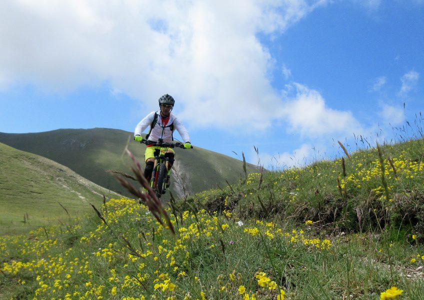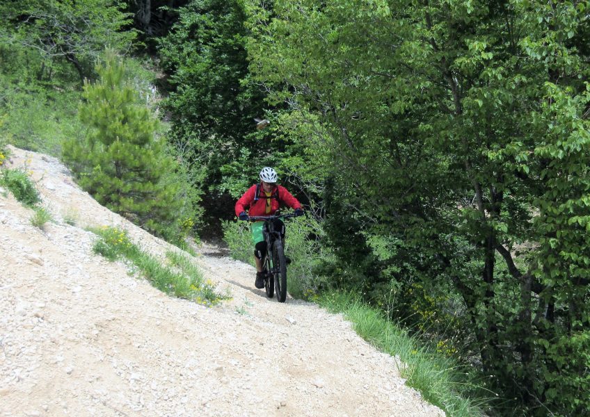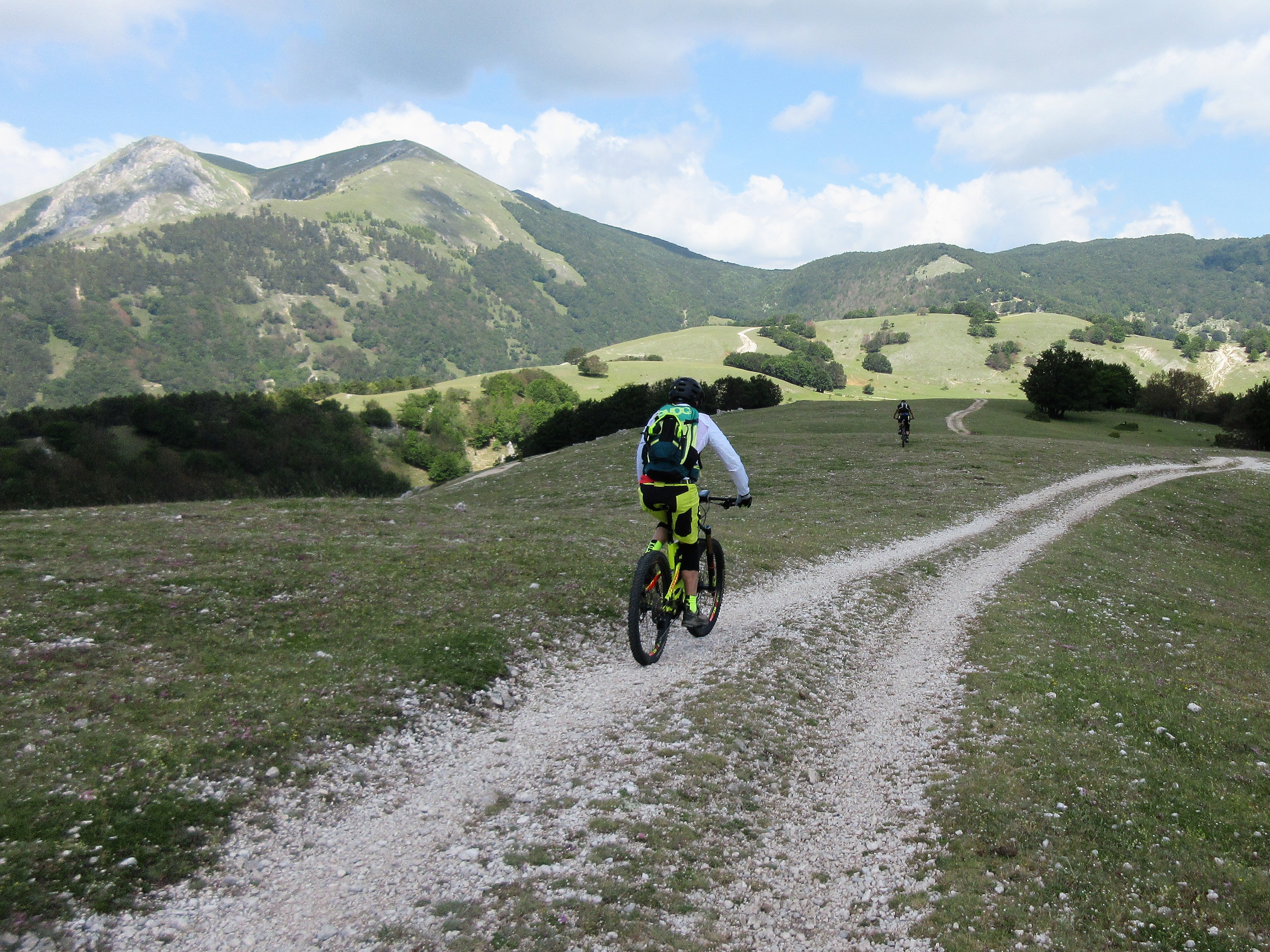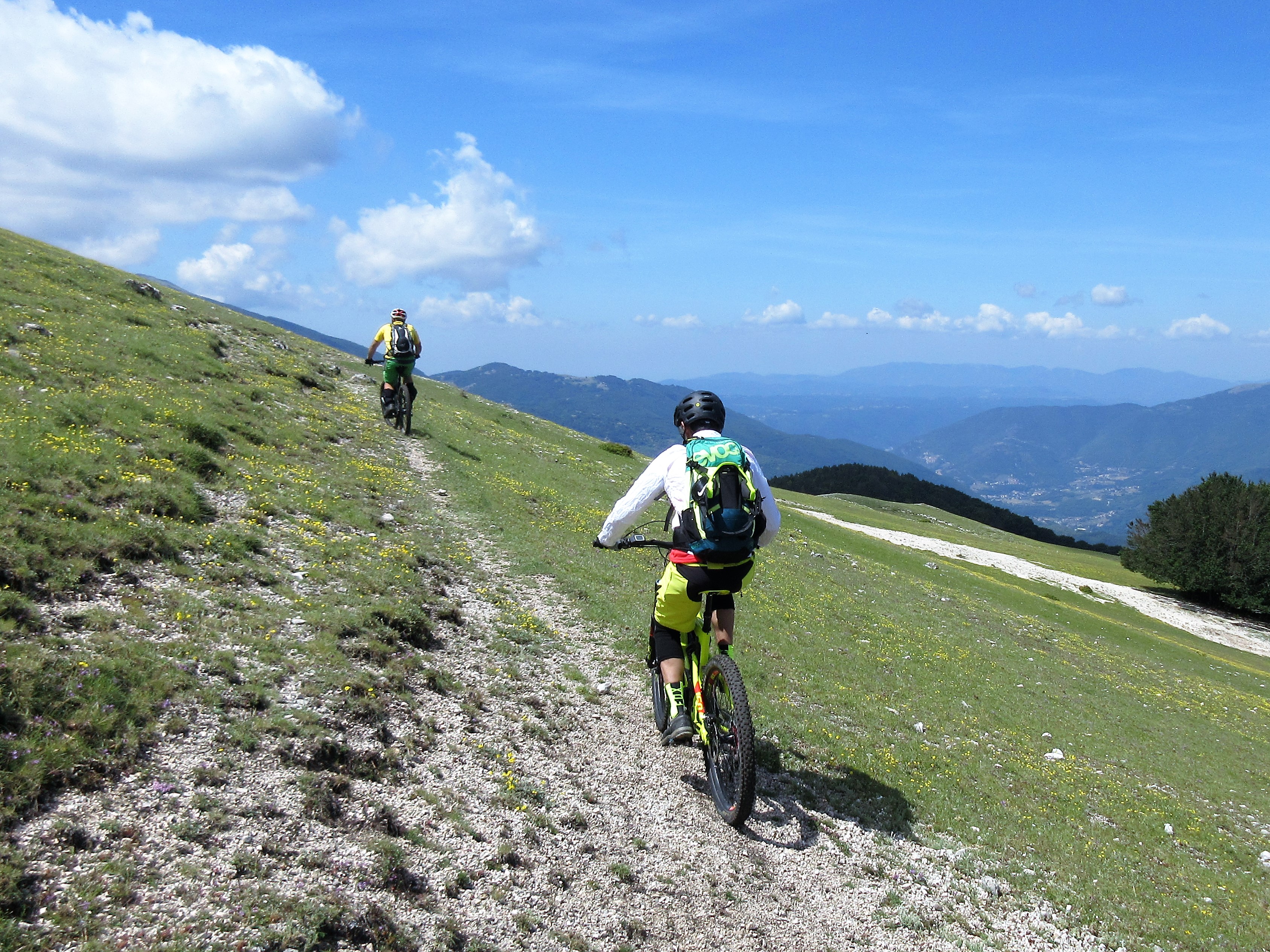 raggiunta una sella prativa, siamo sotto la sommità del monte Giano. Un bel tratto pedalato in e-bike su sentierino con