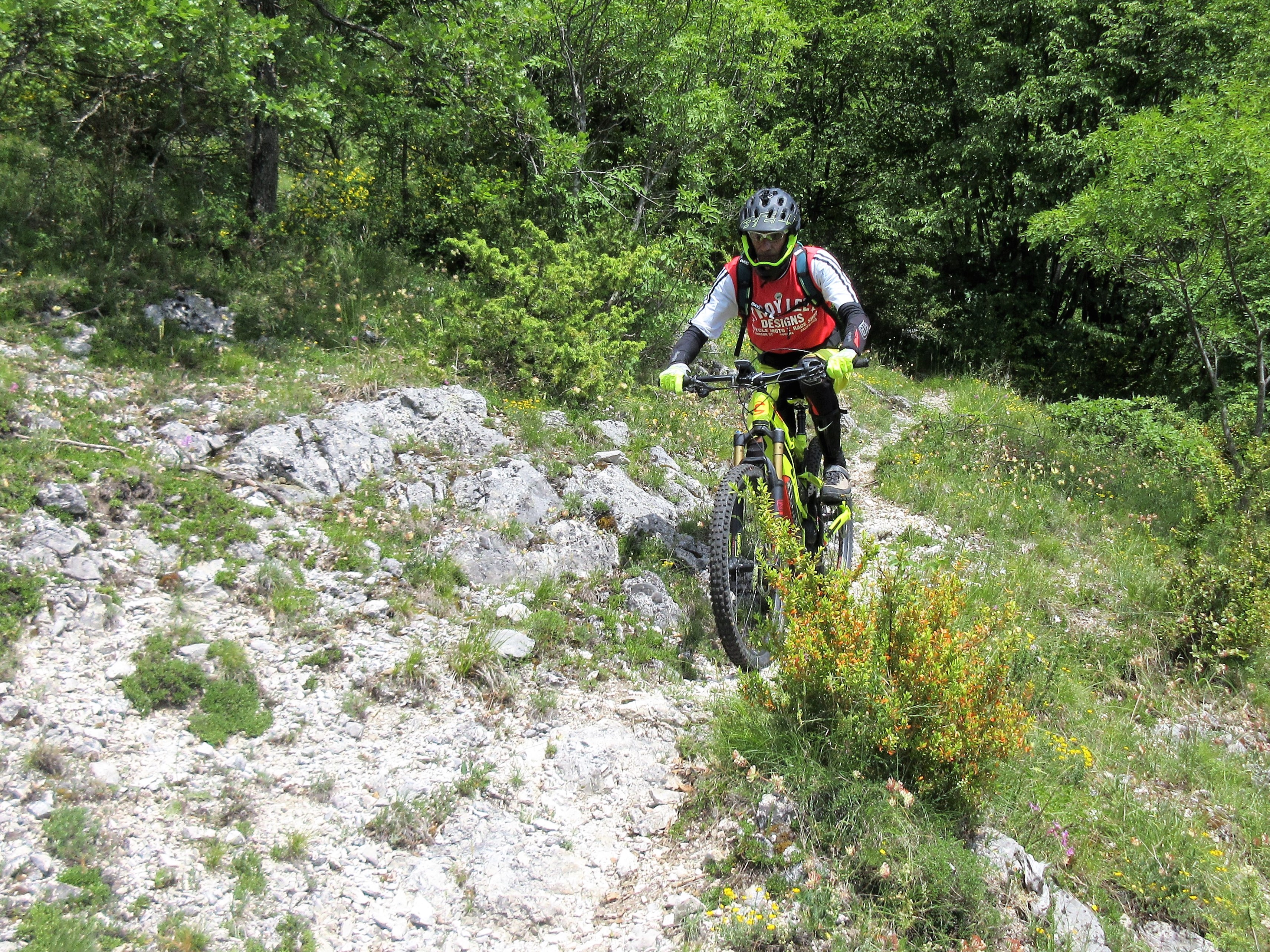 Riepilogando: prerogativa del tour, sono i tratti panoramici dei crinali percorsi di monte Calvo e di monte Giano, che regalano scenari davvero singolari e non presentano particolari difficoltà sotto il profilo tecnico. Se si ha voglia di ammirare questi splendenti paesaggi, bisogna tuttavia mettere in conto che sul trasferimento che collega al sentiero degli Alpini, con tratti stretti, fondo non compatto, varie difficoltà tecniche da superare, caratterizzato da rilanci, occorre un minimo di dinamicità. Mentre le difficoltà maggiori arrivano sul tratto finale, del sentiero degli Alpini, dove è richiesta una buona padronanza del mezzo, in funzione del fondo roccioso molto accidentato e dei tornantini stretti da percorrere. Quest’ultimo tratto è stato trovato un po’ intasato, da rigogliosa vegetazione (unico neo di giornata), complice tra l’altro di aver procurato un breve fuori rotta.