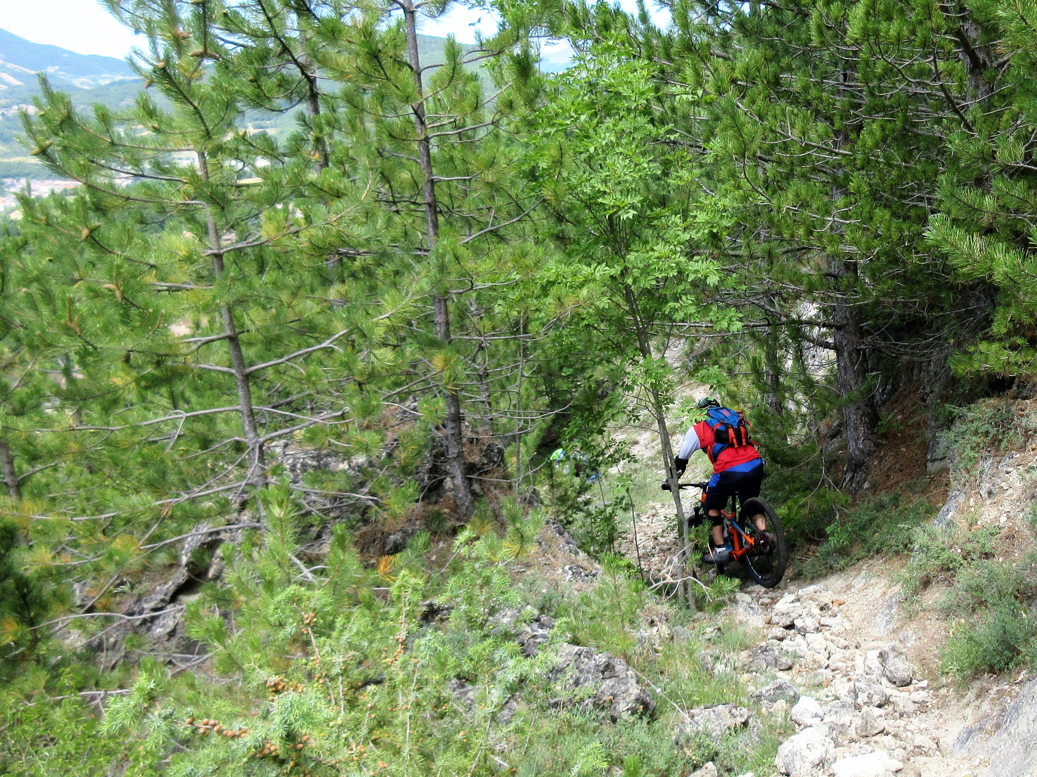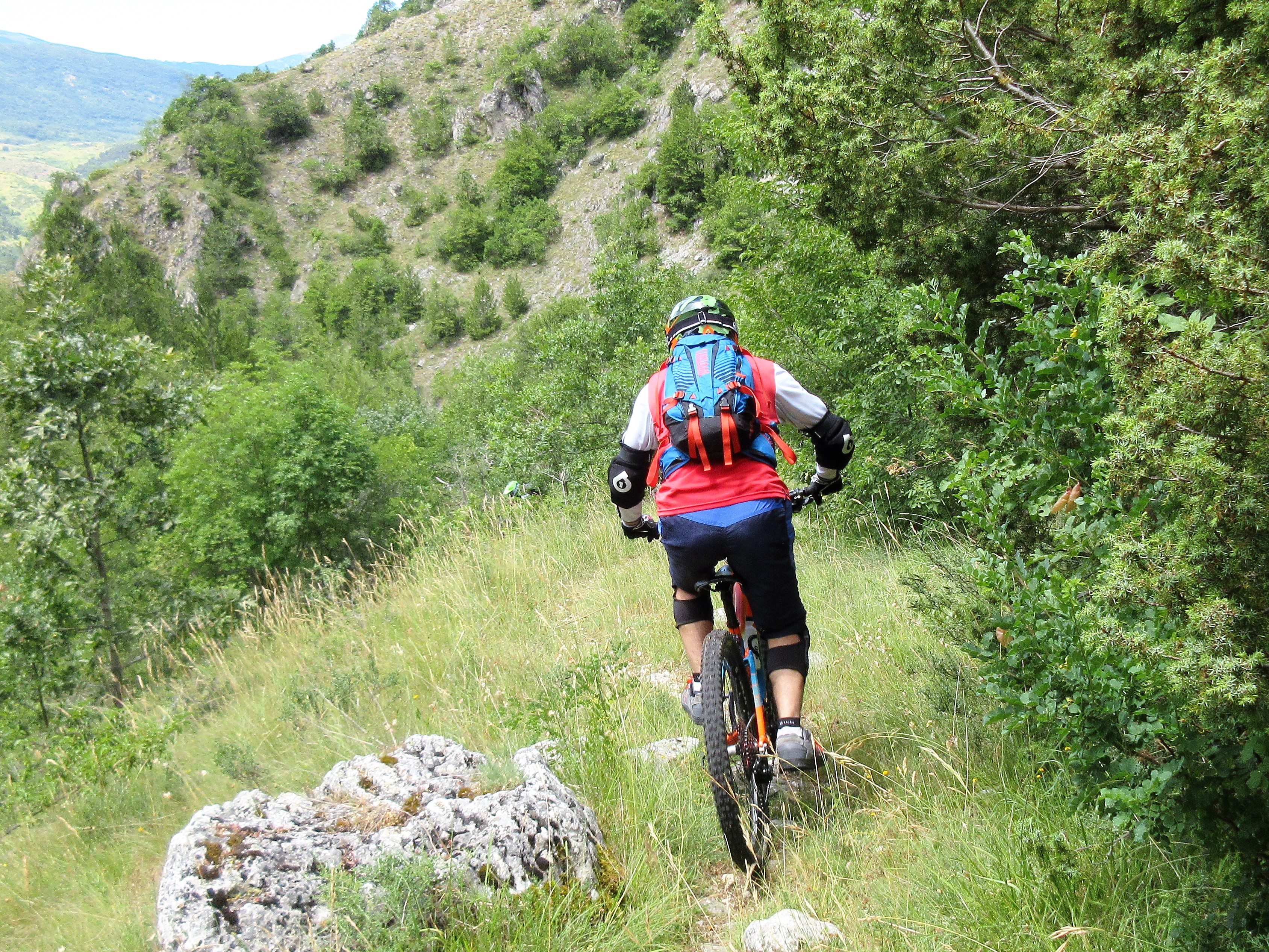 proseguire a spinta, oltrepassata un’impervia strettoia pietrosa ed il letto del un fosso in secca, la traccia torna pedalabile, il single track entra in sottobosco,