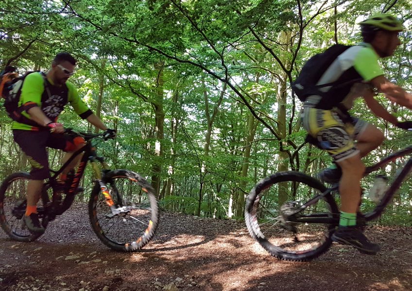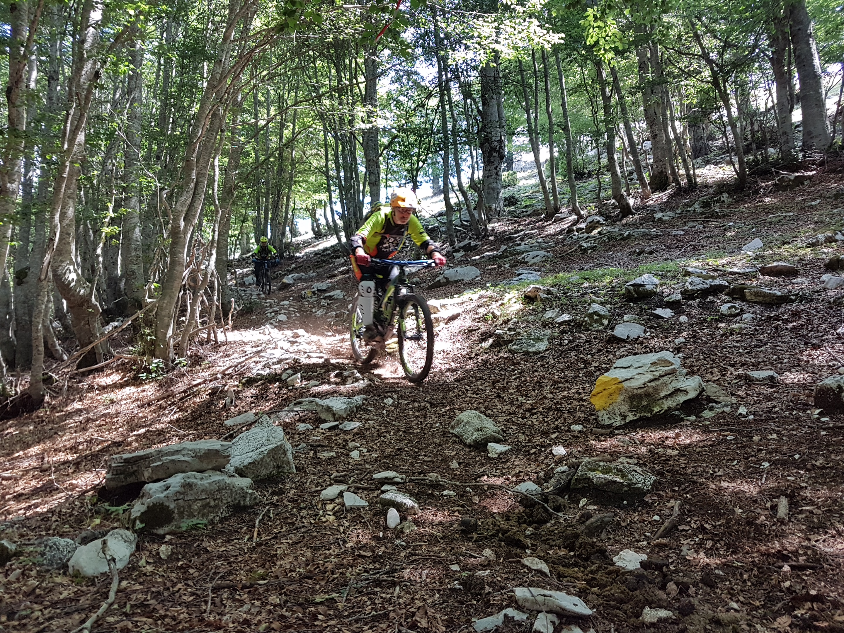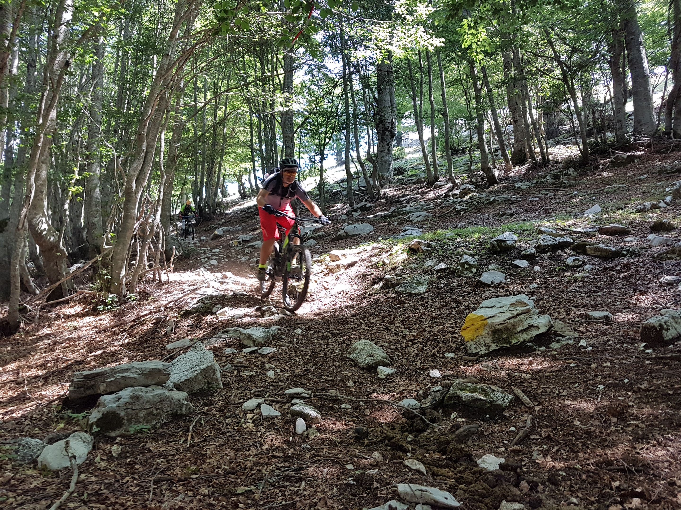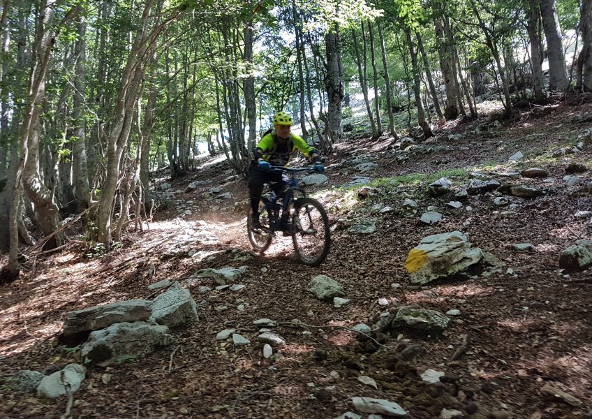 track nel bosco, con fondo misto terra-pietra, intervallato da gradoni, strettoie rocciose e tornantini con fondo smosso.