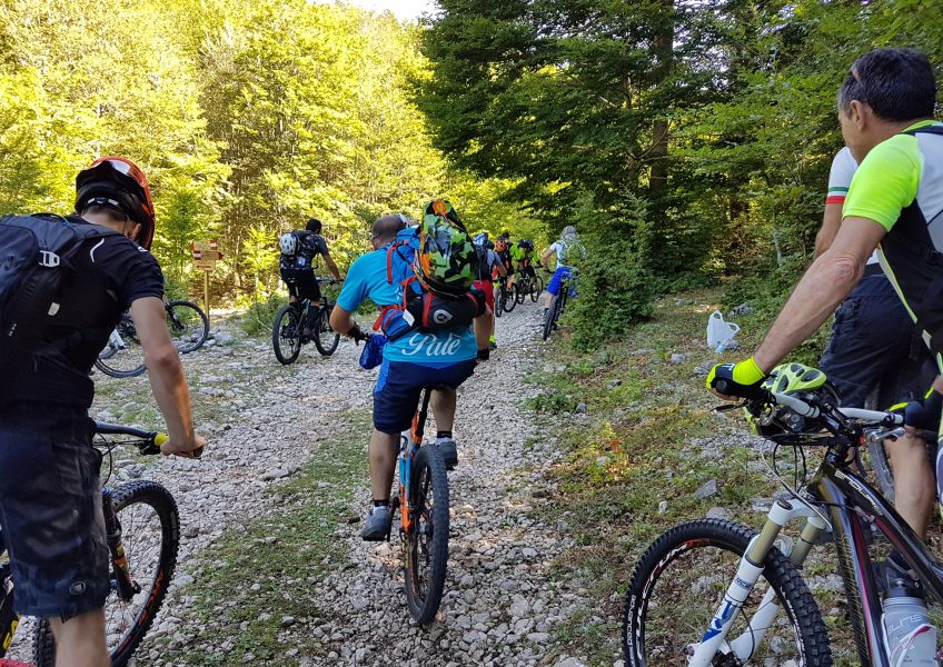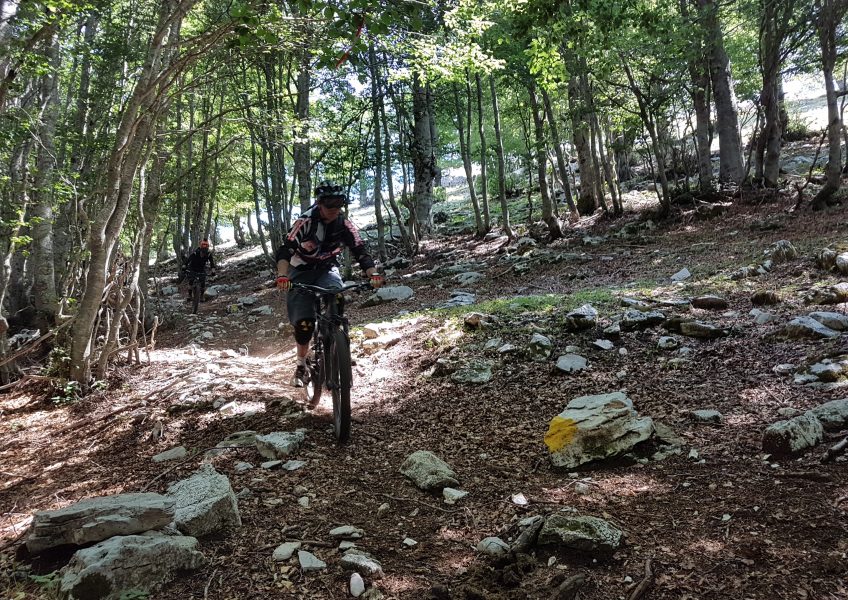 La prima discesa termina all’inizio della salita per Femmina Morta: il sorriso stampato sulla bocca di tutti si spegne immediatamente quando Armando ci comunica che si deve risalire nuovamente per Femmina Morta e proseguire fino a Forca Palomba: salita impegnativa dove le pulsazioni arrivano a livelli molto alti. i più forti l’hanno pedalata tutta, chi non se la sentiva ha spinto, chi aveva le ebike ha sorriso sotto i baffi. Archiviata la salita si parte per l’ultima discesa: il