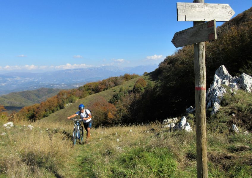 sterrato, su strada asfaltata si raggiunge Collegiove, per una fumante tazza di caffè, al piccolo bar. Qualche centinaio di metri a ritroso per immettersi sul sentiero per il Cervia. Altra pettata, questa volta pedalabile, a seguire i tratti in sella sono davvero pochi ed in bella vista appare la cima del Navegna.