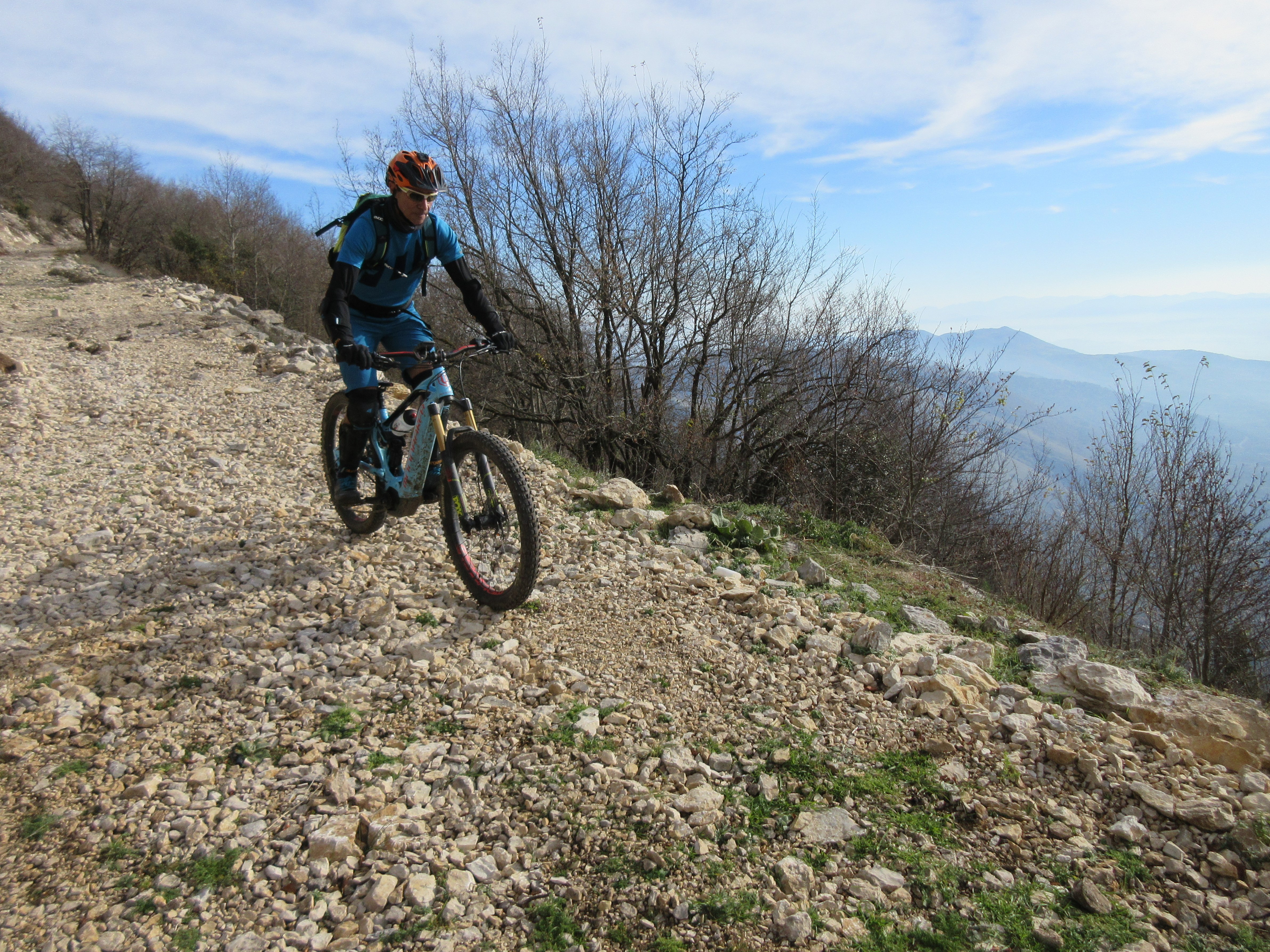 Sintetizzando: la linea gravity, con una partenza pressoché fluida è idonea a prendere il ritmo, diventa poi variegata e divertente, quest’oggi il fondo, ricoperto da un folto strato di foglie, unitamente all’umidità del periodo, hanno reso tutto più intricante. Trasferendosi sul sentiero per l’eremo di San Michele, il trail si trasforma radicalmente, con il fondo molto naturale, costellato di rocce fisse, tratti smossi, tortuosi, pendenze accentuate e difficoltà crescenti fino verso la fine, lascia di certo appagati gli amanti del tecnico naturale. Unico neo i due brevissimi tratti impercorribili a ridosso delle staccionate che obbligano a mettere il piede a terra, ma anche questo fa parte del gioco!
