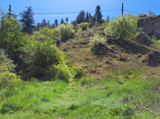 e continua a scendere tortuoso tra gradoni rocciosi, spuntoni e smosso, da non sottovalutare, se si vuole rimanere in sella è richiesto un minino di padronanza del mezzo. Intervallano alcuni tratti flow e altri tra rocce instabili.