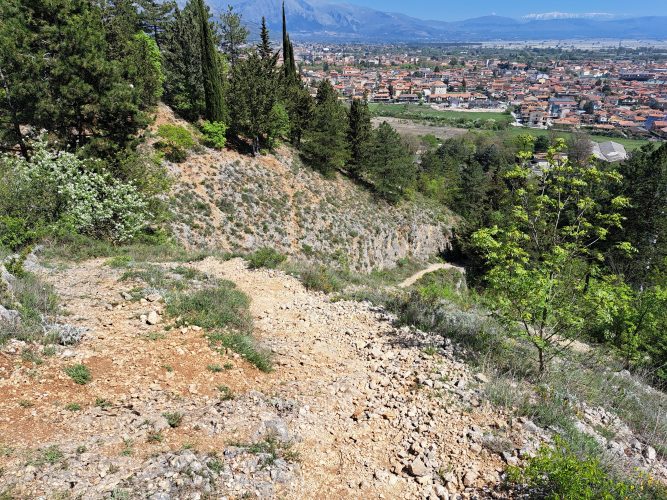 Ora si ricalca il sentiero di Santa Barbara, la prima parte scende fluido a mezzacosta, poi dei spuntoni rocciosi e successivamente uno stretto passaggio roccioso obbligano a scendere. Continuando la pendenza si accentua il trail sempre esposto a valle si fa un po’ più trialistico, per via di passaggi rocciosi. Raggiunti i tetti di Cese dei Marzi (fraz. di Avezzano), si torna a salire per la via del Latte. La salita si inerpica subito e diventa tecnica per via di piccoli gradini, si supera a spinta un primo rock garden, ma il secondo con un po’ di